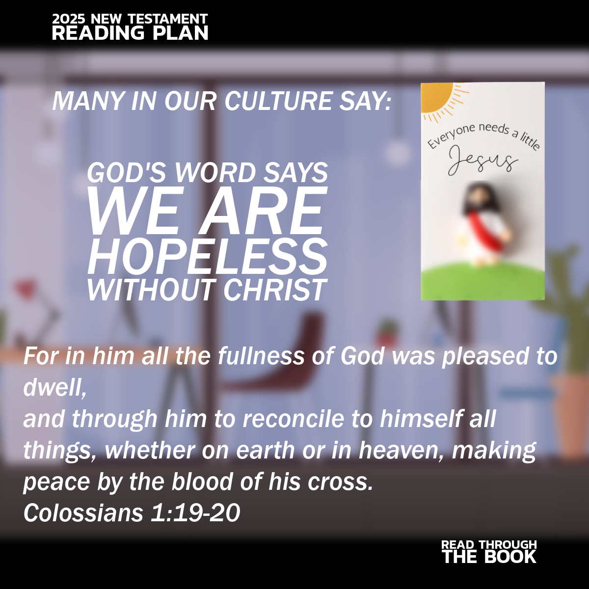 I have noticed that it has become quite the trend to display these little Jesus figures in offices and workplaces. There is a saying that goes with them, “everyone needs a little Jesus.” As I read and meditate on Colossians, I cannot square this little miniature action figure Jesus with the Jesus I read about in the Bible, the same Jesus I call Lord. I certainly cannot square the saying “Everybody needs a little Jesus” with the Bible. For it is true that everyone does indeed need Jesus in order to be reconciled to the Father, but it isn’t just a little Jesus we need, it is a lot of Jesus – all of Jesus. He isn’t some little trinket we add to our lives like a good luck charm, he is the image of the invisible God, the firstborn of all creation, by him were all things made…….He is before all things and in him all things hold together..the head of the body the church..in him the fullness of God was pleased to dwell and through him to reconcile to himself all things, whether on heaven or on earth. We are desperately lost without all of Jesus..His call to be his disciple is not to add a little Jesus to our lives, it is to deny ourselves and follow him, to make him our Lord. Perhaps I am over thinking the little Jesus figures that seem to be everywhere. I know I am not overthinking the preeminence of Christ and what the words of Colossians 1:15-23 say about my Lord and Savior Jesus Christ, for upon such marvelous truth are sinners saved and upon such marvelous truth will those who call upon the name of Jesus gaze for all of eternity.