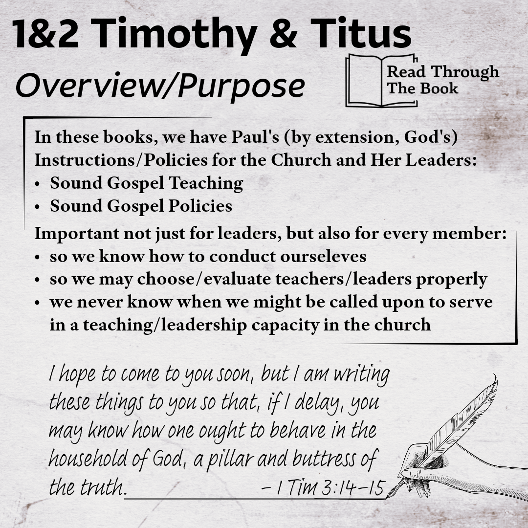 3) So much attention is given to these two topics from 1 Timothy, but there is so much more. We must not loose sight of Paul’s stated purpose for writing; so that “you may know how one ought to behave in the household of God, a pillar and buttress of the truth.” Paul gave instructions to Timothy to pass to the church concerning how we are to conduct ourselves as members of the household of God (demonstrating godliness): guard the sound doctrines of the faith; pray for all people (especially kings and rulers that through their rule; Christians might lead peacefully and quiet lives, dignified in every way); men disciplining one another and women likewise; refraining from irreverent myths, gossip and slander; caring for widows without family; care for and honor the Elders (Overseers) of the church; practice church discipline for the sake of the church and repentance of the sinner, guard yourself from the love of money; pursue righteousness, godliness, faith, love, steadfastness, and gentelenss; and be rich in good works and generosity. I am sure I missed a few, but you get the picture. Timothy is a guide for the church so that we conduct ourselves in a way that honors God. These are not words just for Timothy or the church in Ephesus, they are timeless truths for all of God’s people.