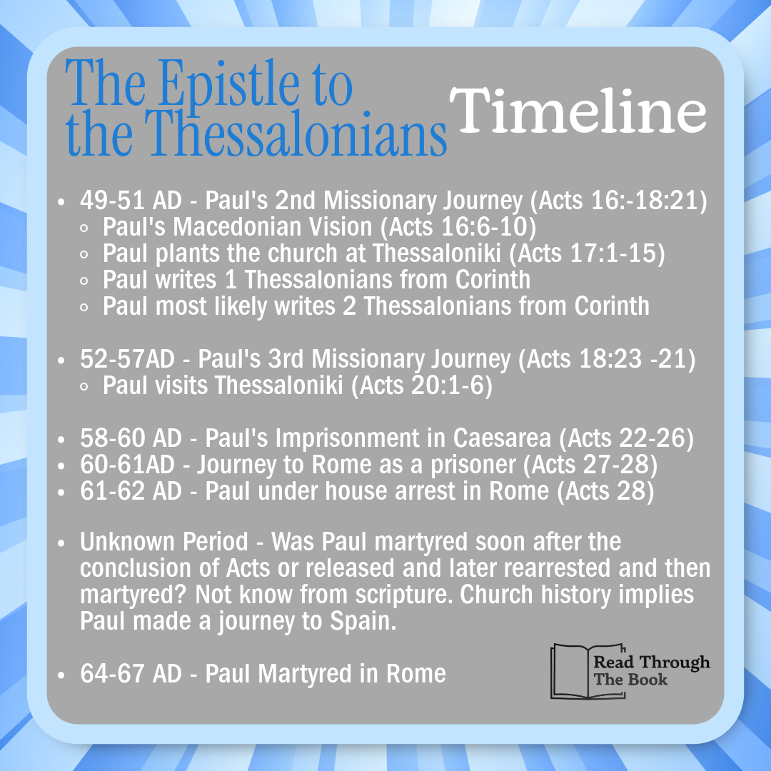 Don’t forget the background of these Epistles. The churches Paul writes to are all connected to his missionary journeys. Even Colossae which it seems Paul never visited was planted by Epaphras, who heard the Gospel from Paul during Paul’s time in Ephesus. Review the attached timeline to reorient you to the Thessalonians who we first met in Acts 17.